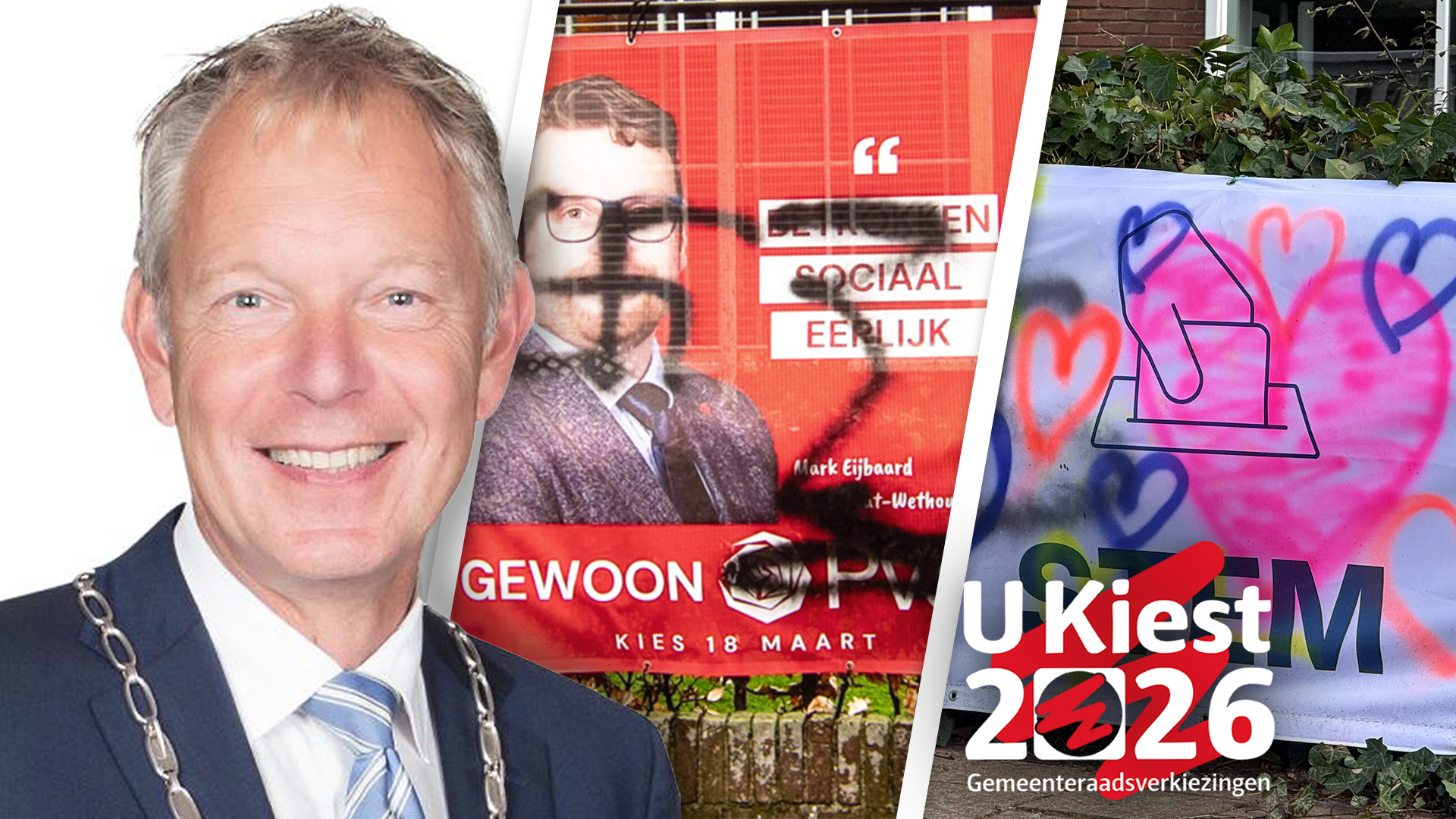 maandag 16 maart 2026, 17:26 uurDe burgemeester van Baarn reageert geschokt op de bekladdingen, hakenkruizen en haatteksten op verkiezingsposters in het dorp. Afgelopen weekend werden verkiezingsspanddoeken in de voortuinen van twee politici beklad. "In de vijftien jaar dat ik burgemeester ben heb ik dit nog niet eerder meegemaakt", zegt burgemeester Mark Röell.
