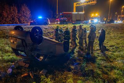 Auto raakt van de weg en vliegt over de kop, twee gewonden