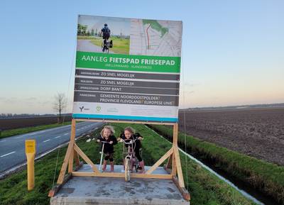 Een groep Bantenaren heeft een nepbouwbord langs het Friesepad neergezet. Op die manier willen de inwoners van het dorp in de gemeente Noordoostpolder aandacht vragen voor de wens om daar een fietspad aangelegd te krijgen.
