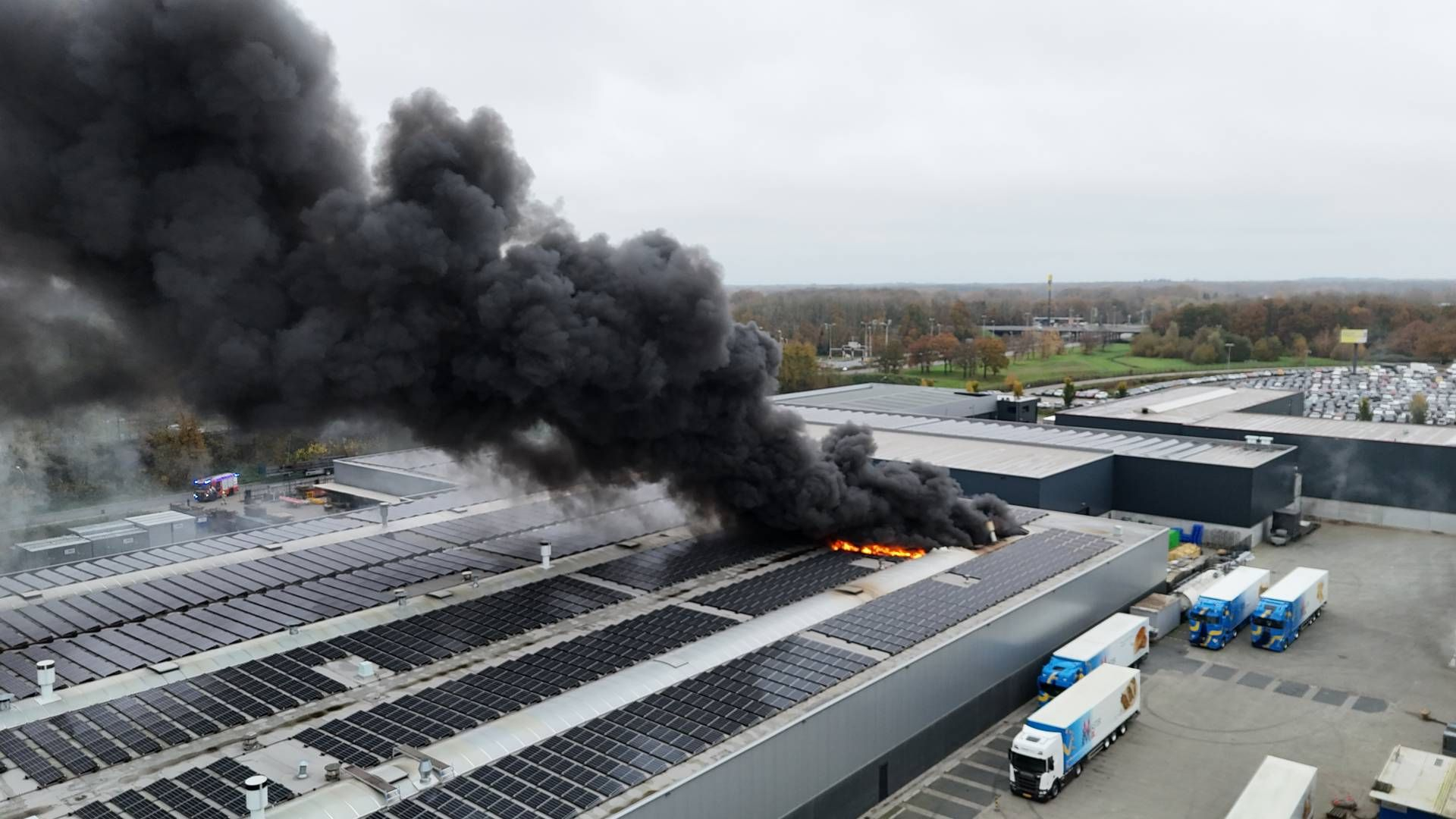 Op industrieterrein De Harselaar aan De Landweer in Barneveld is zondag brand uitgebroken. Grote, zwarte rookwolken slaan uit het dak van een bedrijfshal. De rook is van ver te zien en trekt over de naastgelegen A30, het spoor en woningen.