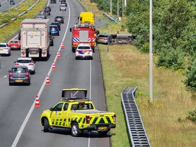 Auto belandt op zijkant na eenzijdig ongeval op A50 bij Beekbergen
