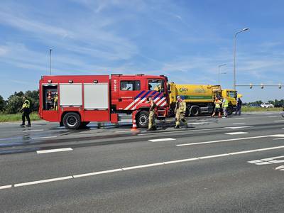 Brandweer blust brandende vuilniswagen op de weg