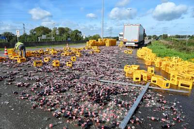 Een scherpe bocht bij een afrit en een lading van tienduizenden colaflessen die verschuift. Resultaat: een snelweg vol plakkende cola en scherpe glasscherven. Het zorgde dinsdag voor een urenlange blokkade van de afrit van de A65 bij Berkel-Enschot. En voor het verlies van een volledige lading cola.