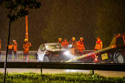 Ongeluk met drie auto's op A2, hulpverleners in stromende regen