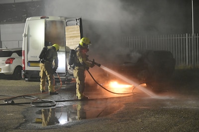 Auto en camper branden uit op verlaten parkeerplaats in Breda, benzine lekt op de weg