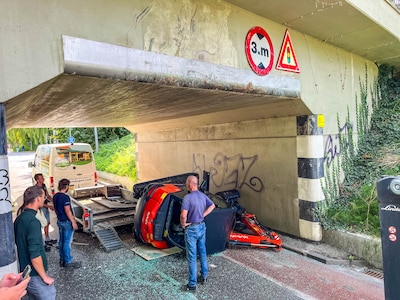 Foutje! Graafmachine valt van aanhanger na botsing met brug
