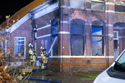 Voorzijde woonboerderij De Krim volledig afgebrand, brandweer probeert vuur in de nok te blussen