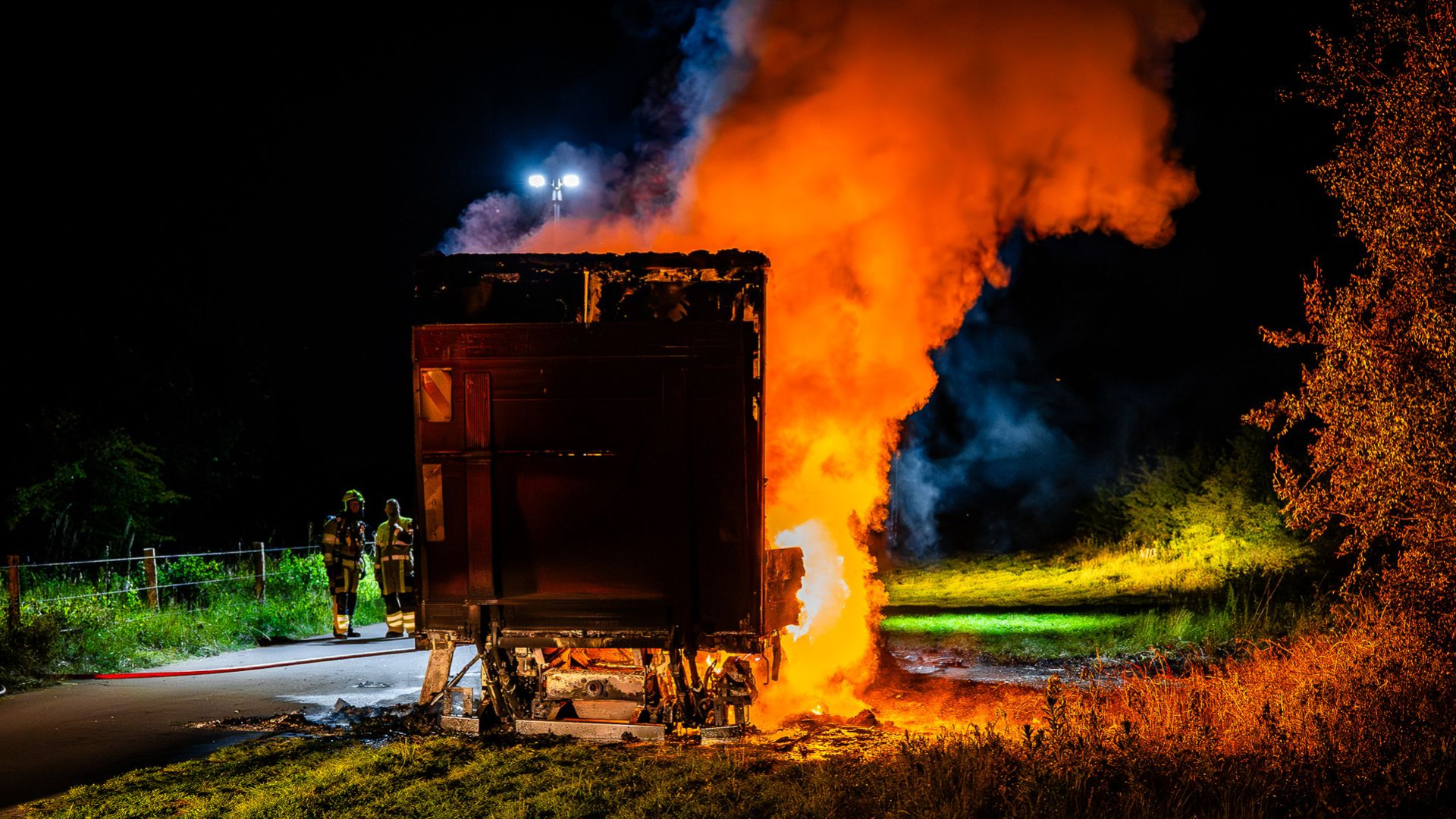 Vrachtwagen met vaten uitgebrand in buitengebied