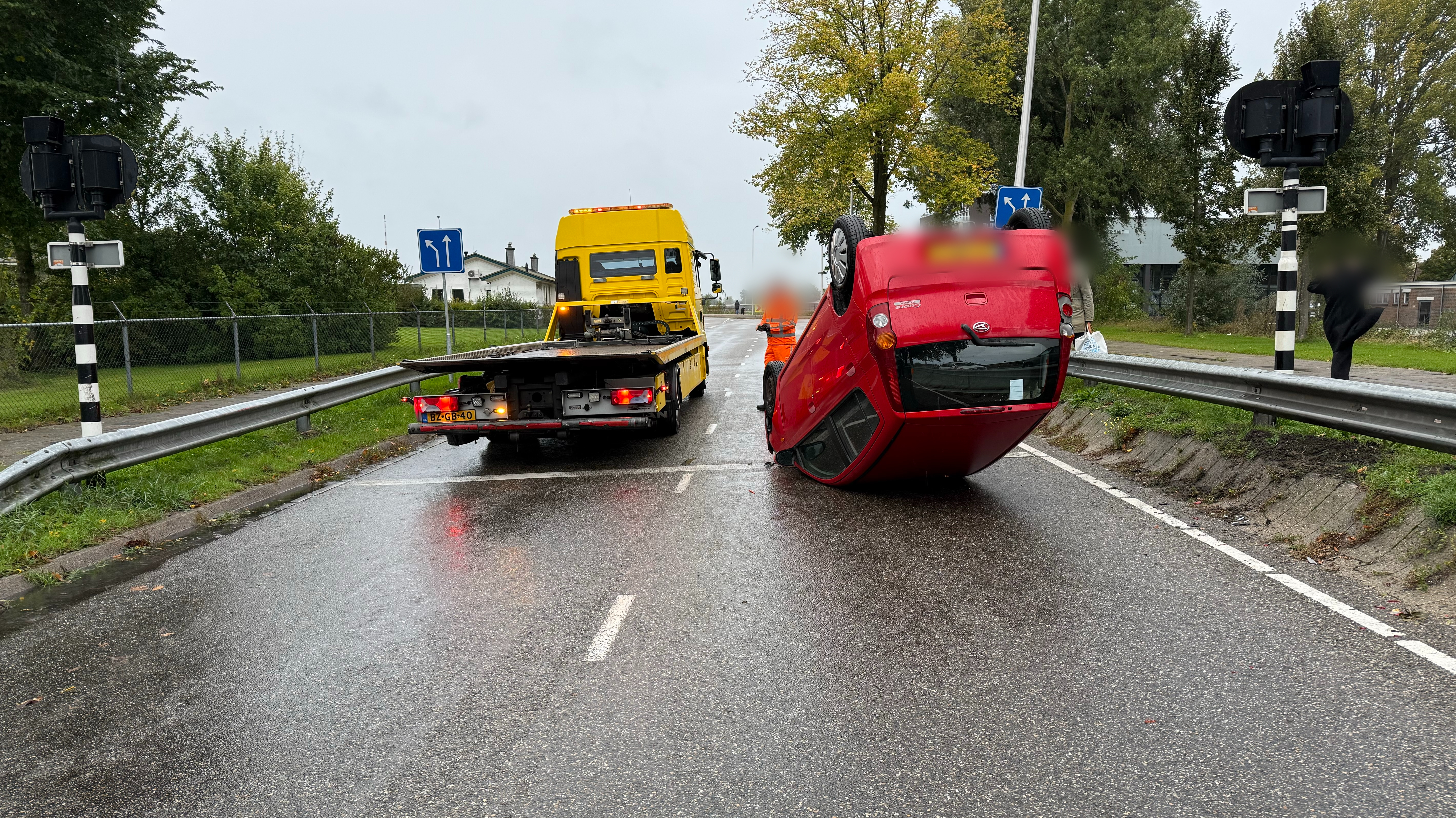 Een opmerkelijk gezicht in Deventer zaterdagavond. Daar is een auto op de kop beland. Het voertuig is tegen een schuine rand gereden en kwam via de vangrail vervolgens ondersteboven terecht op het asfalt.