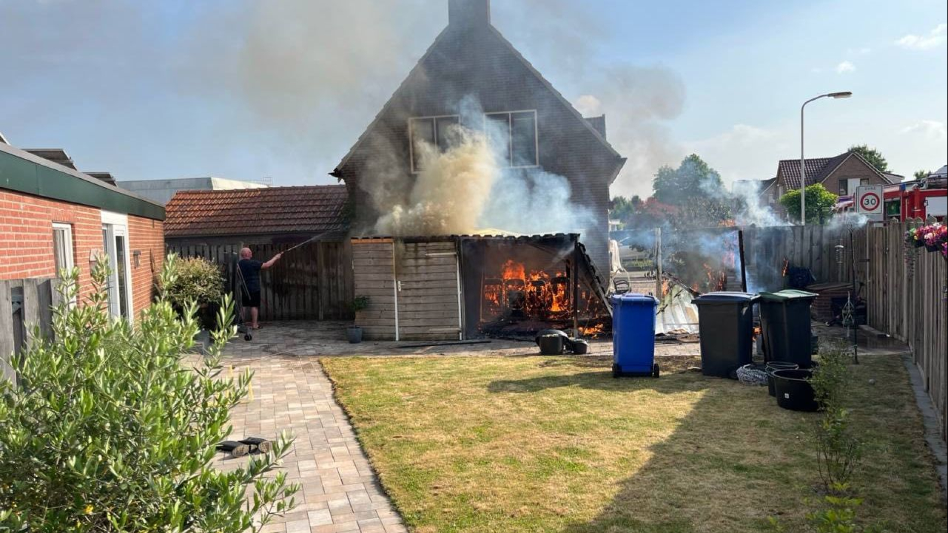 Vlammen slaan uit schuur, bewoner grijpt in met tuinslang