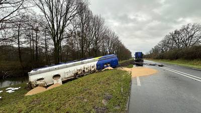 Tankwagen vol diervoer kantelt, weg afgesloten