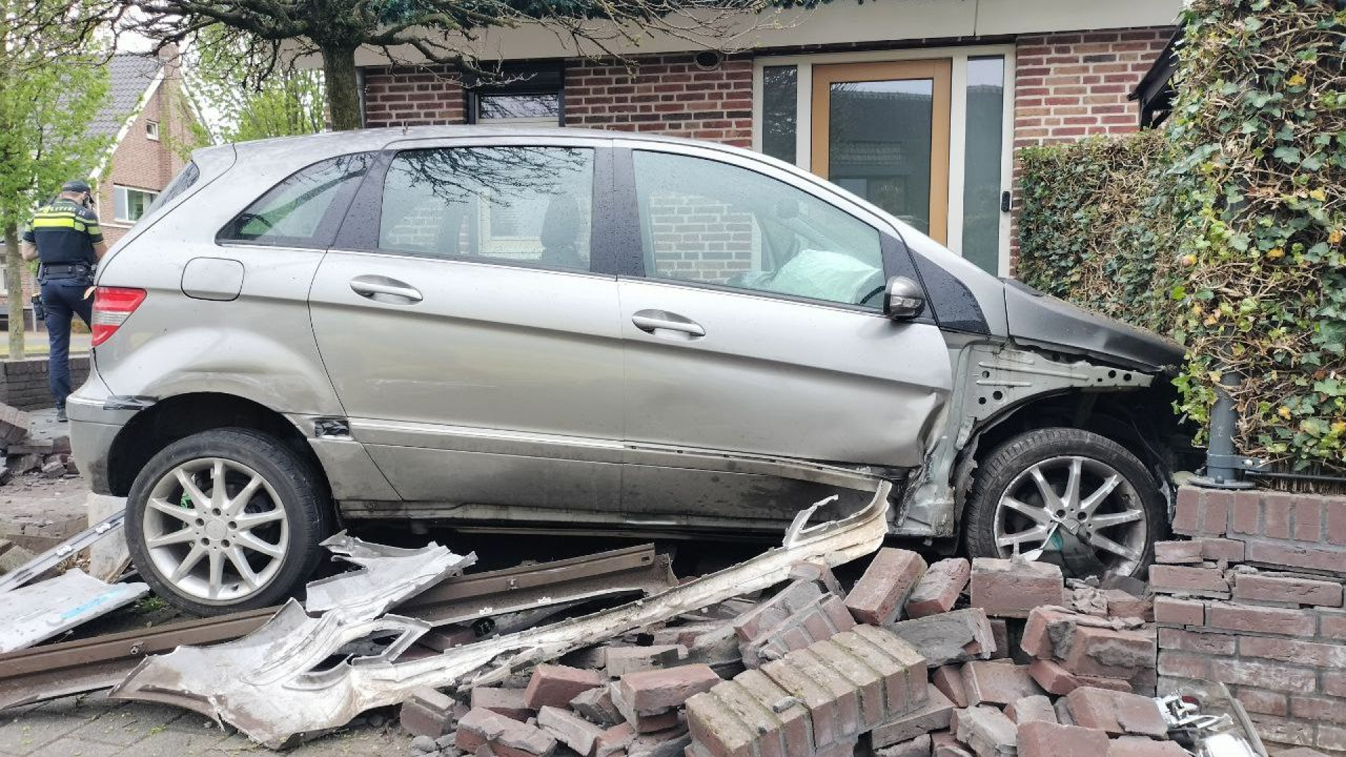 Automobilist ramt paaltjes, lantaarnpaal en parkeert auto op muurtje in voortuin