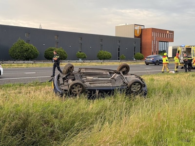 Auto belandt op de kop in berm langs A18