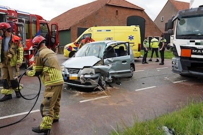 Vrouw bekneld in auto na botsing met vrachtwagen