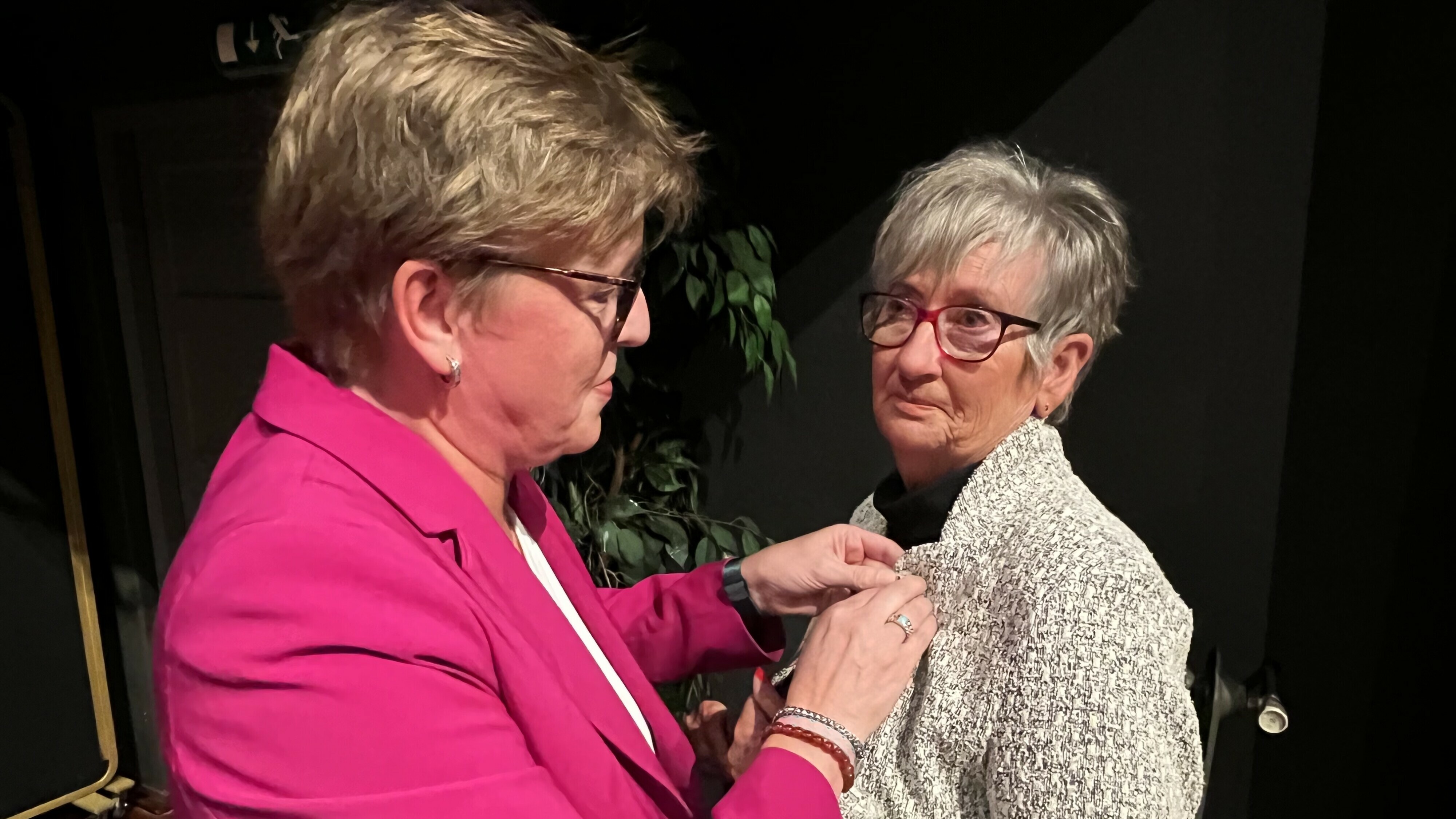 maandag 10 februari 2025, 09:56 uurln Grand Café De Brink in Dwingeloo heeft directeur Renate Snoeijing uit naam van bestuur en medewerkers de erespeld van het Huus van de Taol bij Ans Klok opgespeld.