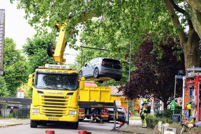 Brand in elektrische auto die geparkeerd stond, wagen in speciale dompelbak getakeld