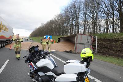 Vrachtwagen kantelt op snelweg