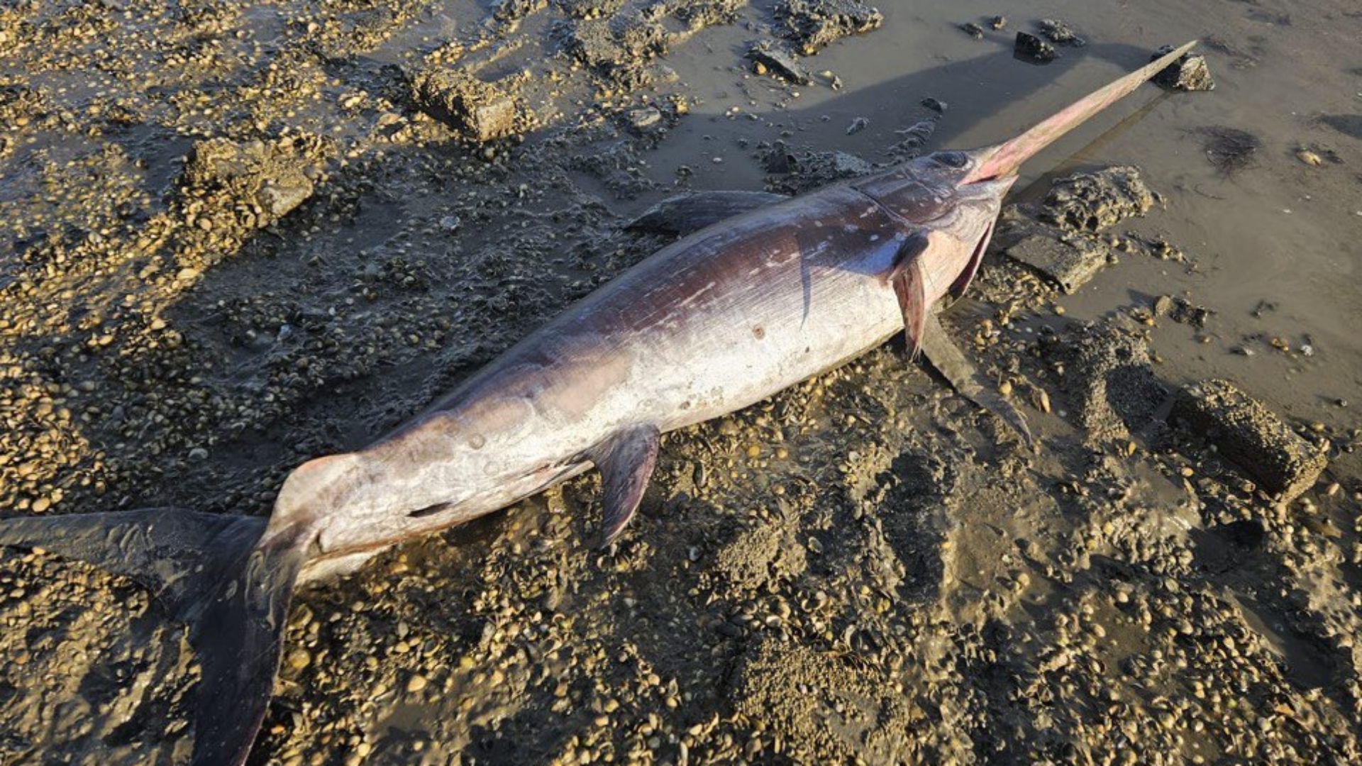 Op het wad bij de Eemshaven is een zeer zeldzame zwaardvis aangespoeld. Dat is vrij bijzonder, zo’n veertig jaar geleden gebeurde dat voor het laatst in Nederland.