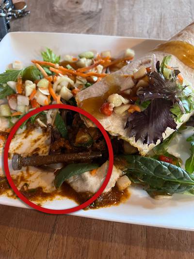 vrijdag 19 mei 2023, 23:13 uurHet klinkt smakelijk: een gevulde wrap met gebakken groenten en pittig gekruid runderstoofvlees. Bernadet Vroon (33), verslaggever bij deze krant, ging er dan ook eens goed voor zitten toen het gerecht vanmiddag werd geserveerd in Elburg. Maar na een paar happen vond ze een verrassing op haar bord: ,,Wat is dit?”
