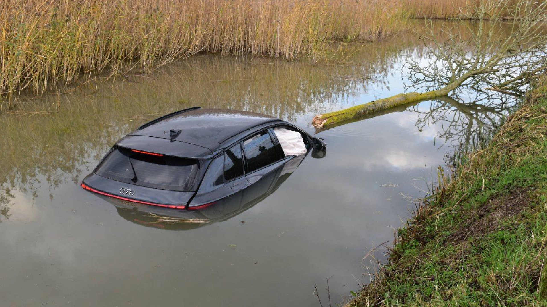 Automobilist ramt boom en belandt in het water, dan schieten omstanders te hulp
