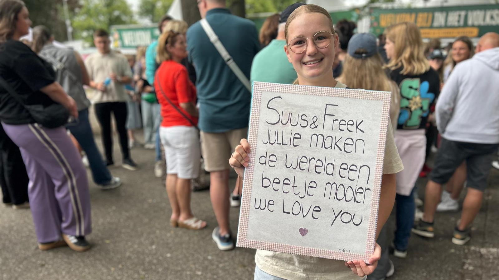 Suzan & Freek treden pas vanavond op in het Volkspark in Enschede, maar vanochtend om half elf stonden de eerste fans al te wachten. Toen om 13:00 uur de poorten van het festivalterrein open gingen, renden ze naar het hoofdpodium, in de hoop op een goede plek. "Ik vind het gewoon zo bijzonder dat ze nu weer komen optreden", vertelt een van hen.