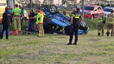 Auto op zijn kop na botsing: brandweer bevrijdt klemgeraakt slachtoffer