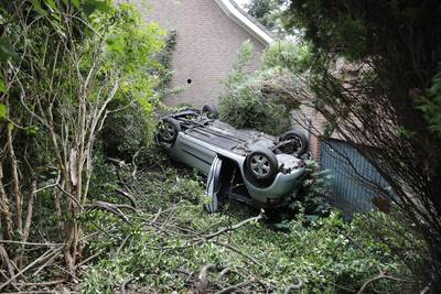 Auto belandt op de kop tegen achtergevel van woning in Fijnaart