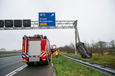 Auto belandt ondersteboven tegen pilaar van wegportaal op A16 bij Breda