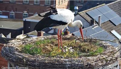 Je moet goed kijken, maar dan zie je het ook: de ooievaars op het stadhuis van Gennep hebben sinds een paar dagen kleintjes, inmiddels vijf. Het mannetje is de vaste nestbewoner sinds 2008. Sinds vorig jaar heeft hij een nieuw vrouwtje.