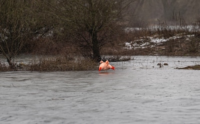 maandag 16 februari 2026, 17:19 uurEen stel bijzondere badgasten bij Strand Giese Kop vlakbij Giesbeek: op maandag zagen voorbijgangers ineens twee felroze flamingo's tussen de eendjes staan. De roze vogels worden wel vaker in het wild gesignaleerd in Nederland; net over de Duitse grens bij Groenlo is namelijk een groot broedgebied.