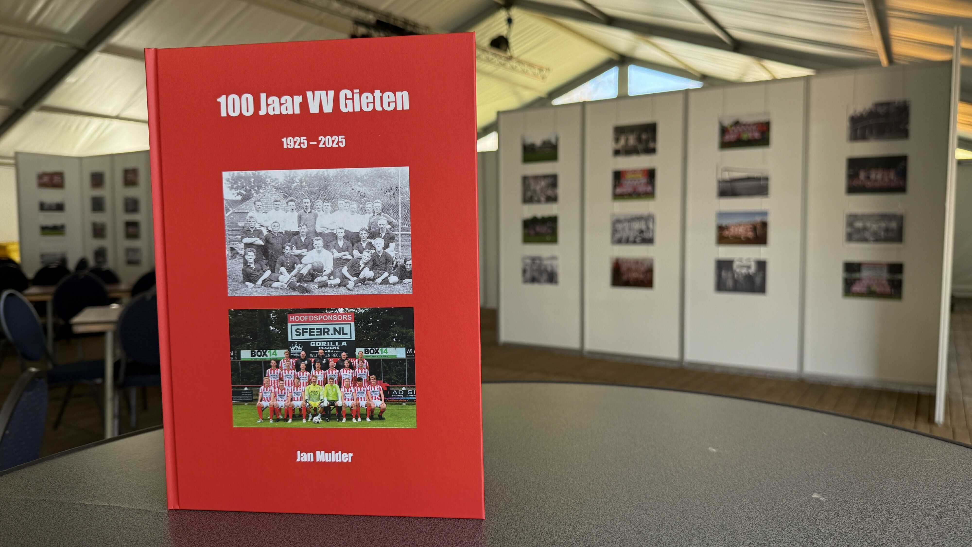 In een tent bij de sportvelden van VV Gieten zijn ook tientallen foto's te bekijken uit de beginjaren van de club tot en met nu.