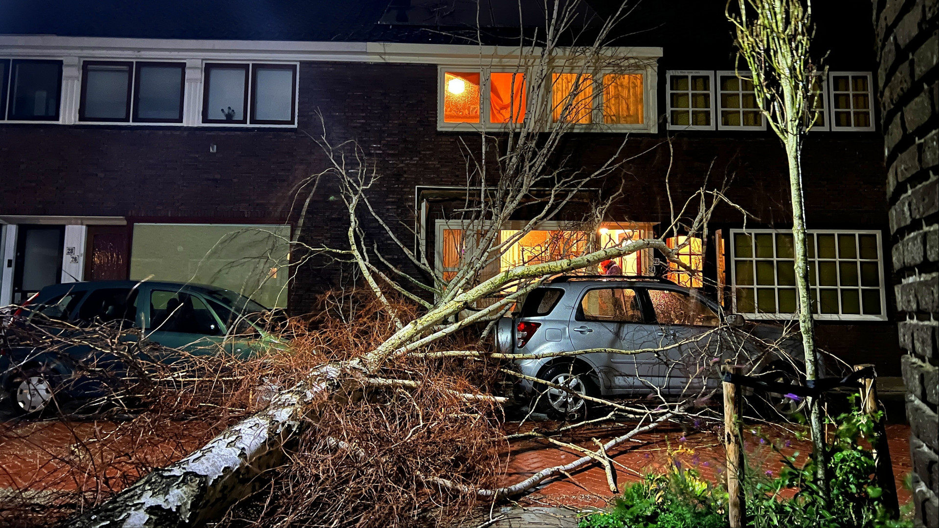 Schade door storm Aitor: boom waait om en valt op auto en tegen huis aan