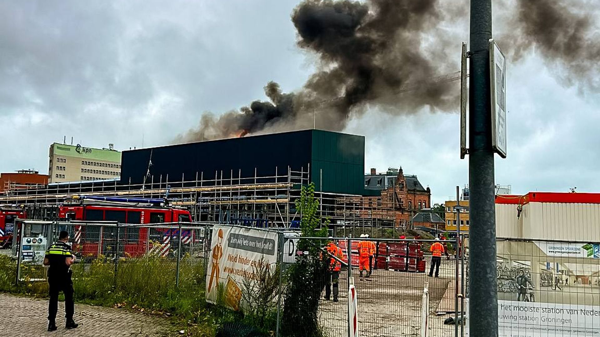 Er rijden geen treinen tussen de stations Groningen en Groningen Europapark vanwege een brand bij het Hoofdstation in Stad. Een gebouw achter het station staat in brand, en de rook trekt richting het station.
