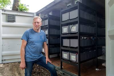 Energie opslaan als de stroomprijs negatief is en terugleveren aan het net als het tarief weer positief is. Energieboer Arjan Prinsen uit Haarlo verdient zo slim geld met een zeecontainer vol met accu’s. Dé oplossing nu het nieuwe kabinet de salderingsregeling wil schrappen?