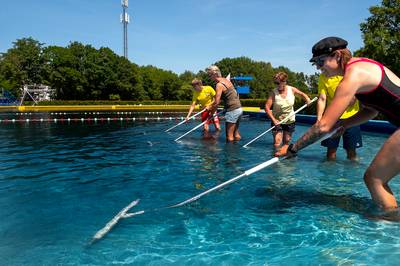 Zwembad De Melanen vrijdag deels weer open, personeel verwijdert zwarte laag uit bassins
