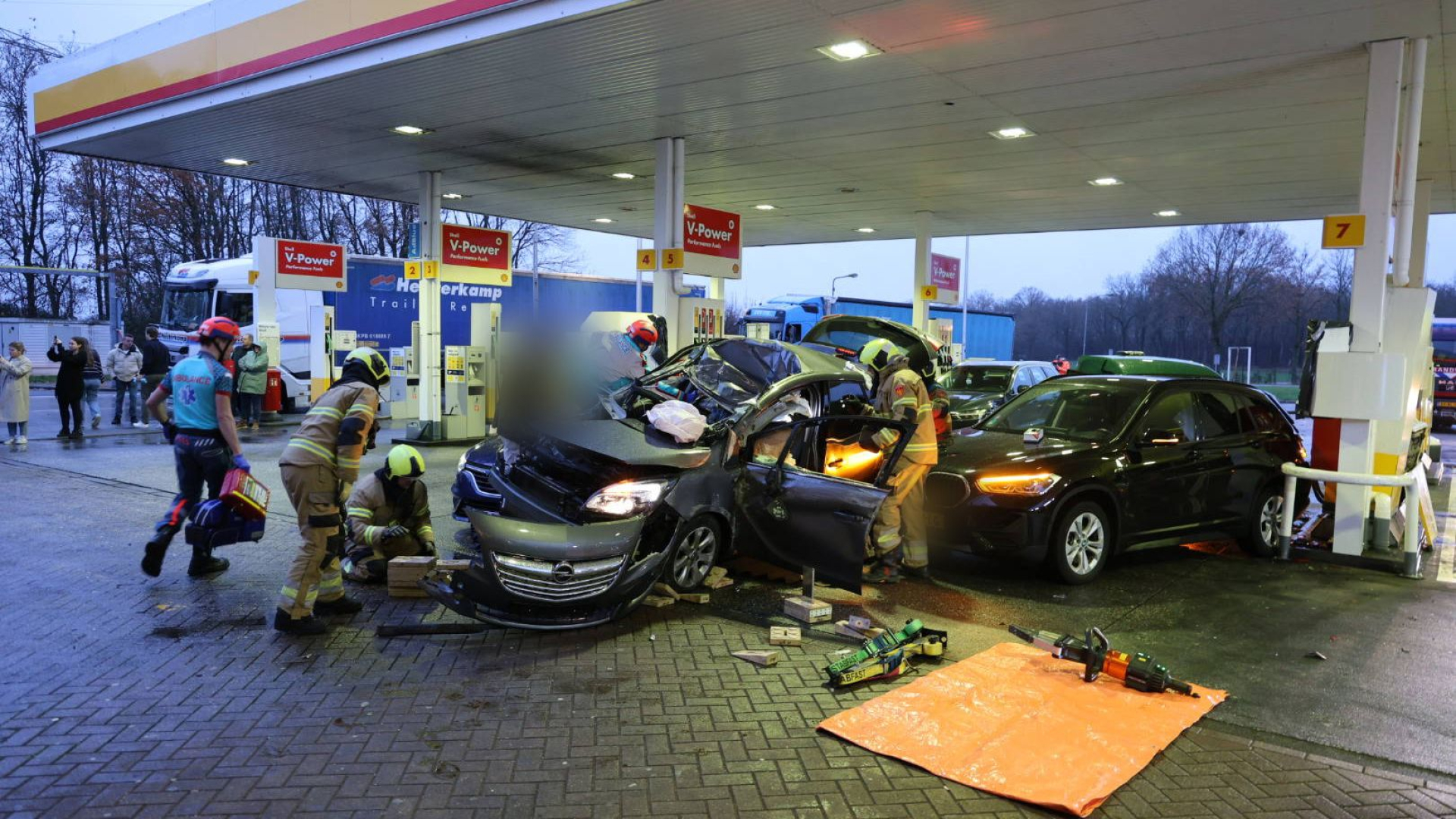 Zwaar ongeluk bij tankstation, slachtoffer bekneld in auto