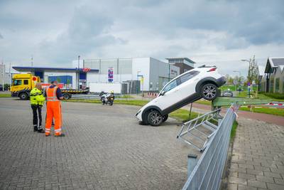 Een auto is op curieuze wijze boven op een metalen stellage en een hekwerk terechtgekomen in Houten vanochtend. Volgens de bestuurder gebeurde dat toen zijn auto ‘op hol’ sloeg.