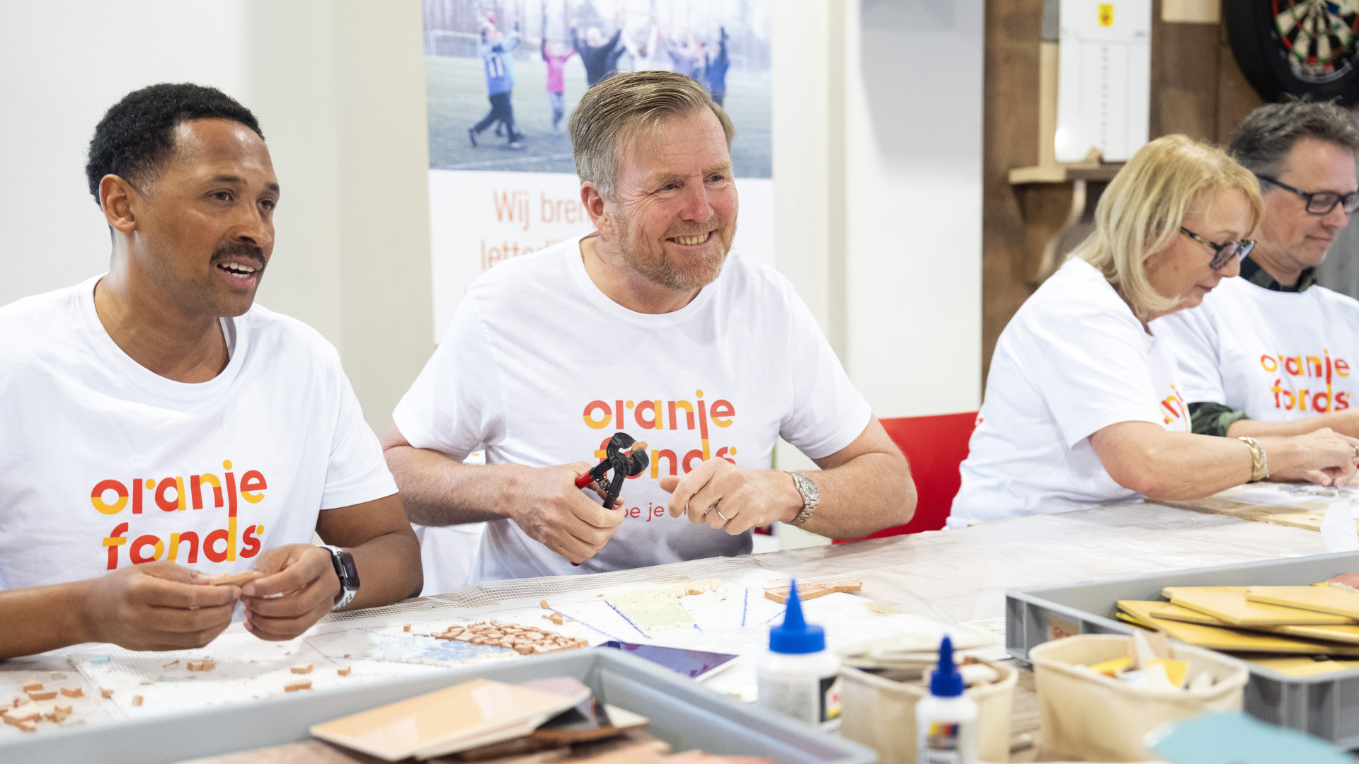 Koning Willem-Alexander en koningin Máxima hebben zich vrijdag tijdens NLdoet ingezet voor de verfraaiing van een buurthuis in Katwijk. In Oranje Fonds-kleding en met stevige schoenen ging het paar aan de slag met mozaïekwerkjes die de muren van het buurthuis opvrolijken.