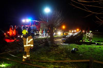 Auto rijdt bomen uit de grond en slaat over de kop, bestuurder gevlucht