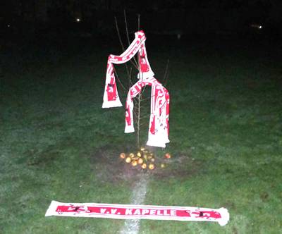 Supporters Kapelle planten voor de derby appelboom op middenstip Kruiningen