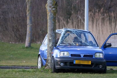 Auto ramt boom in Lelystad: zijkant volledig ingedrukt