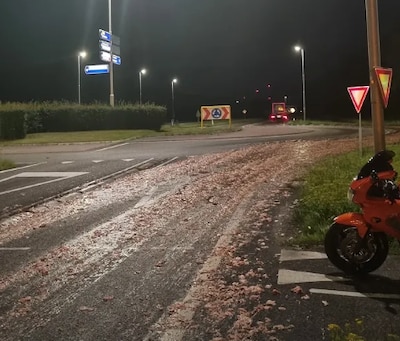 Vrachtwagen verliest slachtafval: weg glibberig, motorrijder onderuit