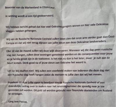 De politie waarschuwt inwoners van Etten-Leur niet in te gaan op een dreigbrief die in meerdere brievenbussen is gestopt. Daarin staat dat hun huizen in de gaten worden gehouden. Als ze geen Russische vlag ophangen of geld overmaken dan wordt hen dat betaald gezet.