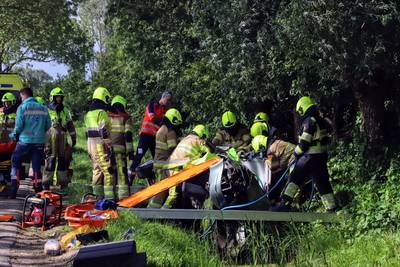 Auto belandt in sloot na botsing tegen boom, brandweer bevrijdt automobiliste