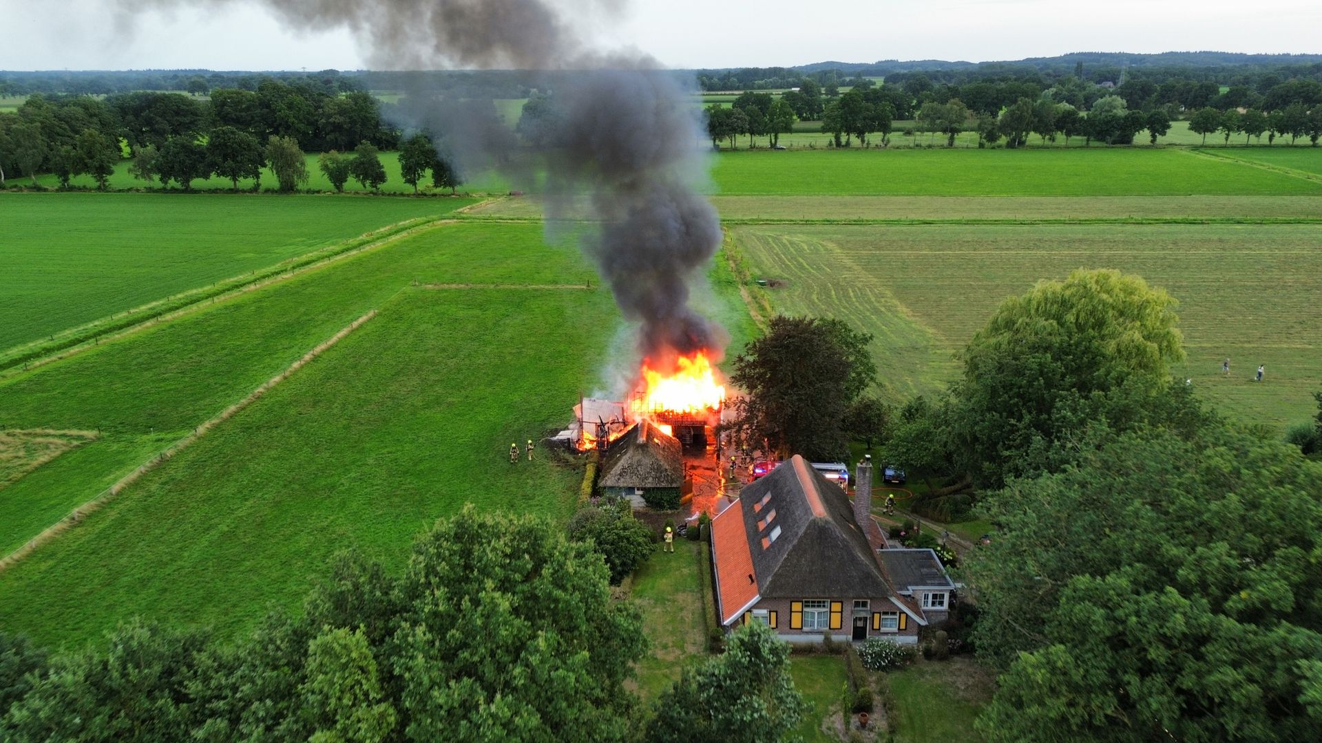 Brand in schuur met zonnepanelen, woning met rieten kap gespaard
