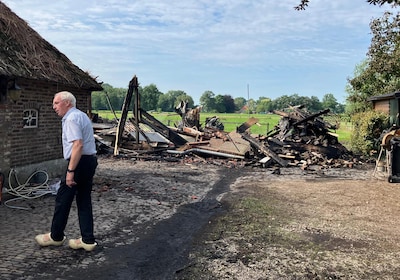 donderdag 7 augustus 2025, 13:49 uurEen laatste pluim rook stijgt op uit het puin dat gisteren nog de schuur van Henk (81) en Derkje Kleinhesselink (80) was. Henk trekt zijn klompen aan en loopt verbijsterd over zijn erf. De brandlucht dwaalt nog vers over zijn terrein in Lochem.