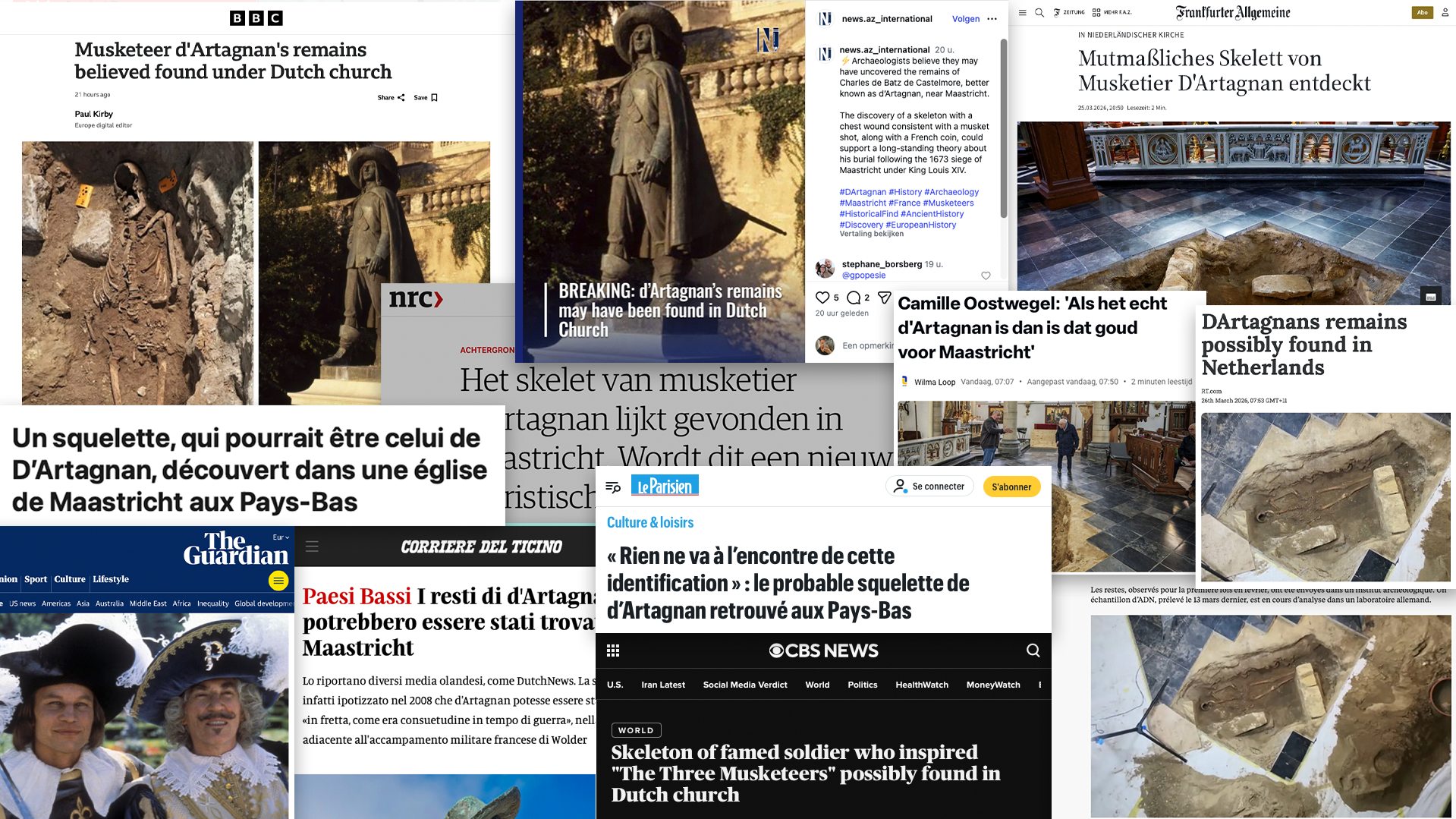 donderdag 26 maart 2026, 07:45 uurHet nieuws dat de resten van de wereldberoemde Franse musketier d'Artagnan wellicht zijn gevonden onder de vloer van de kerk van Wolder, haalt ook in de rest van de wereld de headlines.