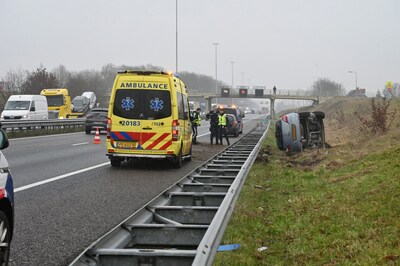 Bestuurder verliest macht over het stuur, auto belandt op zijkant naast A58