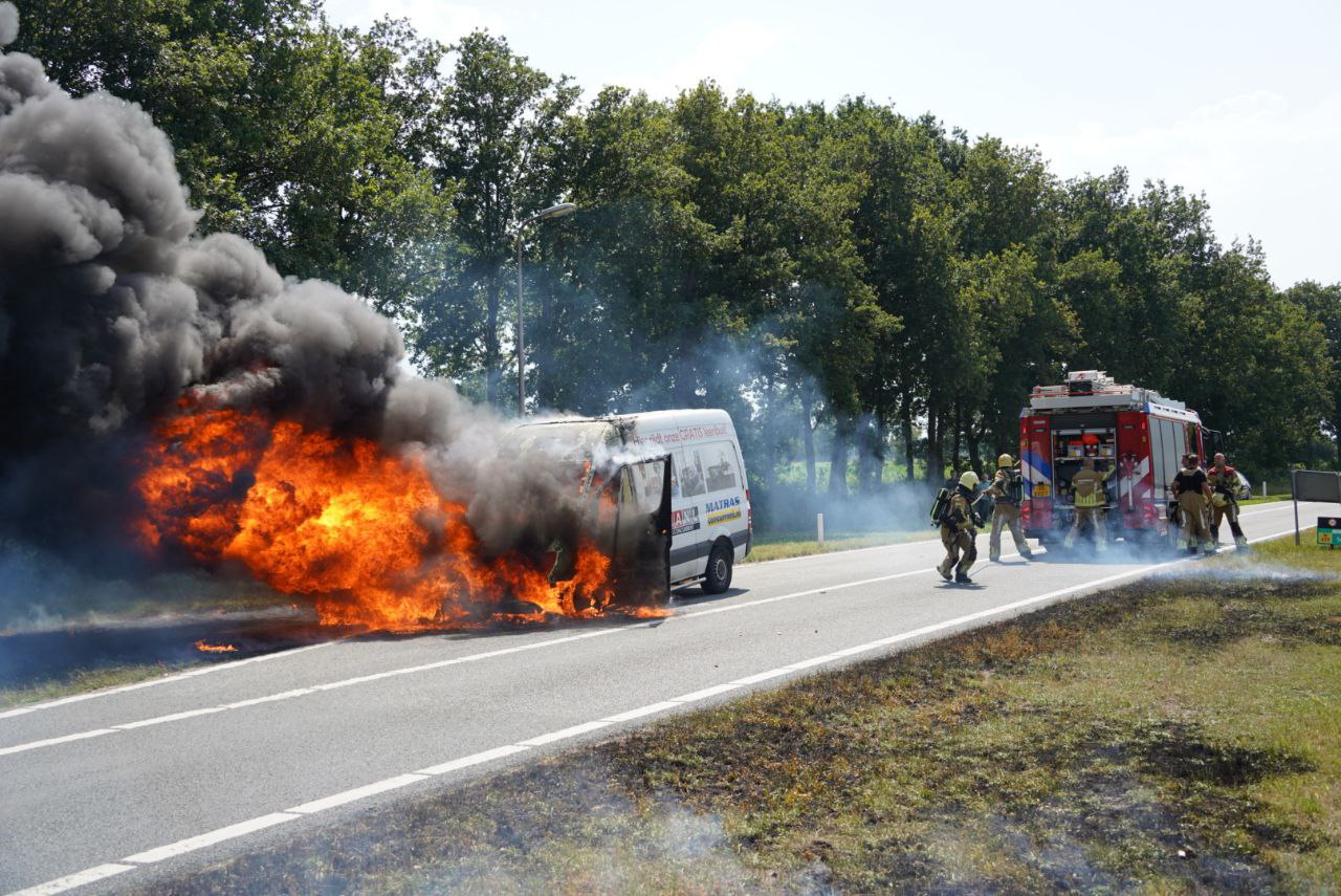 Bestelbus in brand op N377, afrit Nieuwleusen afgesloten