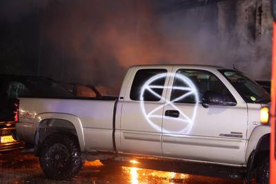Weer logo Extinction Rebellion aangetroffen bij brand, meerdere pick-up trucks verwoest
